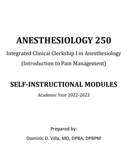 Welcome to the Integrated Clinical Clerkship I in Anesthesiology : Introduction to Pain Management. As Anesthesiologists, we are tasked to provide excellent Acute Pain Management to our patients peri-operatively. As the founder of the Pain Clinic and part of the Philippine General Hospital's multidisciplinary pain management team, we take care of inpatient and outpatient cancer and non-cancer patients. During this rotation with us, it is our hope that you will have a better understanding of pain, its basic and clinical principles, to better equip you as you progress in your medical education. Later, you will realize that as a physician, it is your duty or ethical obligation to alleviate, if not eliminate, your patient's pain and suffering.