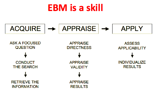 1. Acquiring the evidence. In order to acquire the evidence, we need to be able to ask or frame a focused clinical question from the clinical dilemmas we encounter when taking care of patients. Being able to search the literature systematically and efficiently is important in retrieving the most current available evidence to answer our clinical question.